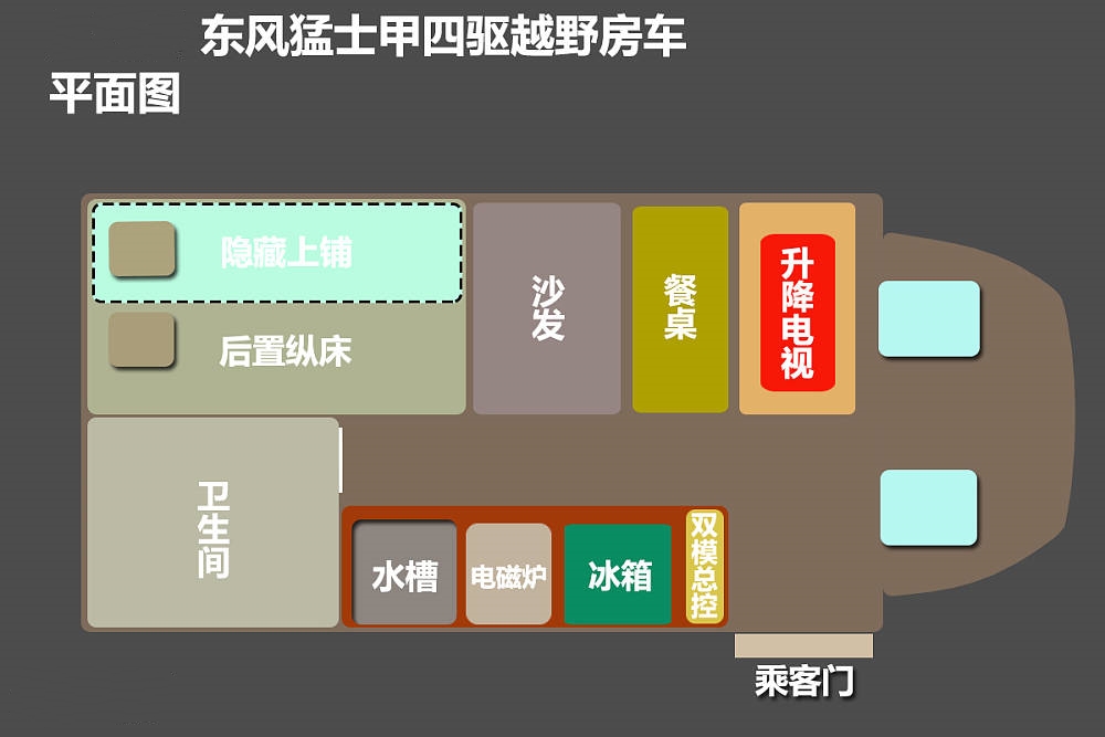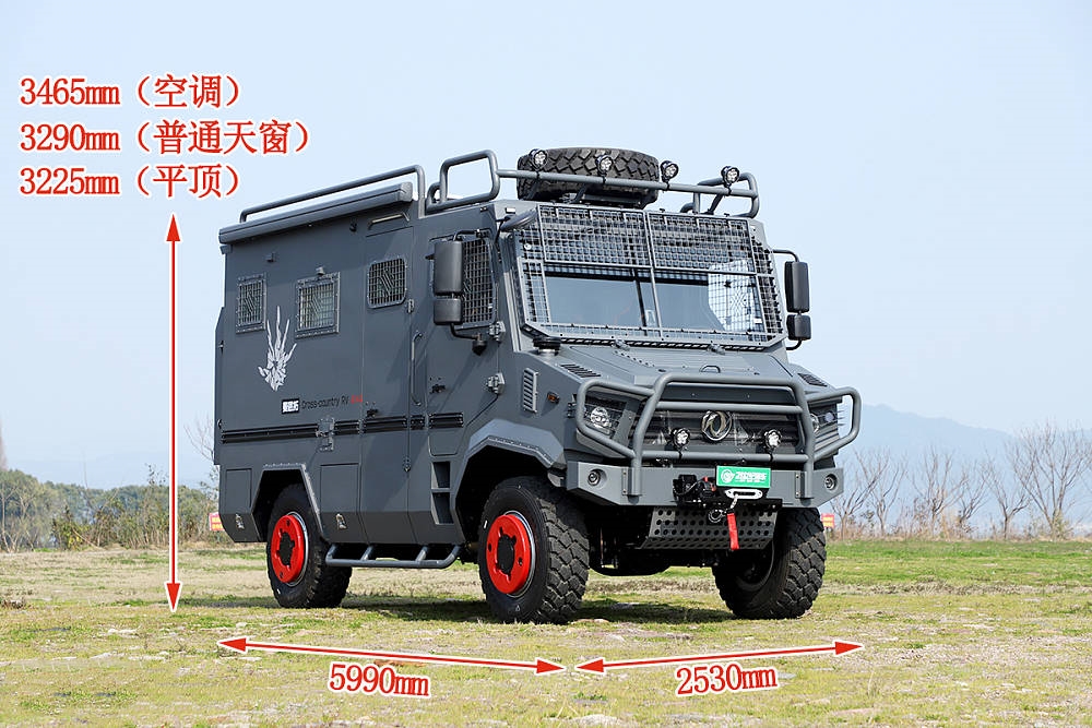 東風猛士甲四驅越野房車基于二汽東風正向開發多功能旅居車底盤打造,長寬高分別為5990×2530×3225/3290/3465(mm),軸距3700mm,200L油箱。其中,根據配置不同,對應的總體車身高度也會有相應變化,如上圖所示。動力方面,搭載東風康明斯生產的4.5L直列四缸增壓中冷發動機,匹配法士特雙特6AT變速箱,最大功率162kW,最大扭矩820N·m,上藍牌C本駕駛,符合國六排放。對駕乘舒適感要有更高要求的話,可以選配艾里遜6AT變速箱;配置方面,包括銅水箱、發動機預熱、尿素加熱、油路加熱、定速巡航、前后差速鎖、轉向減振器、高低速分動箱、越野車專用沖壓式雙級減速橋、盤式制動器、輪胎自動充放氣系統等一些硬核裝備;值得一提,輪胎自動充放氣系統是為適應野外各種復雜路況而生,面對荒漠及松軟沙地時可一鍵放氣,增大地面附著面積,通過增加摩擦力來實現更強的通過性。