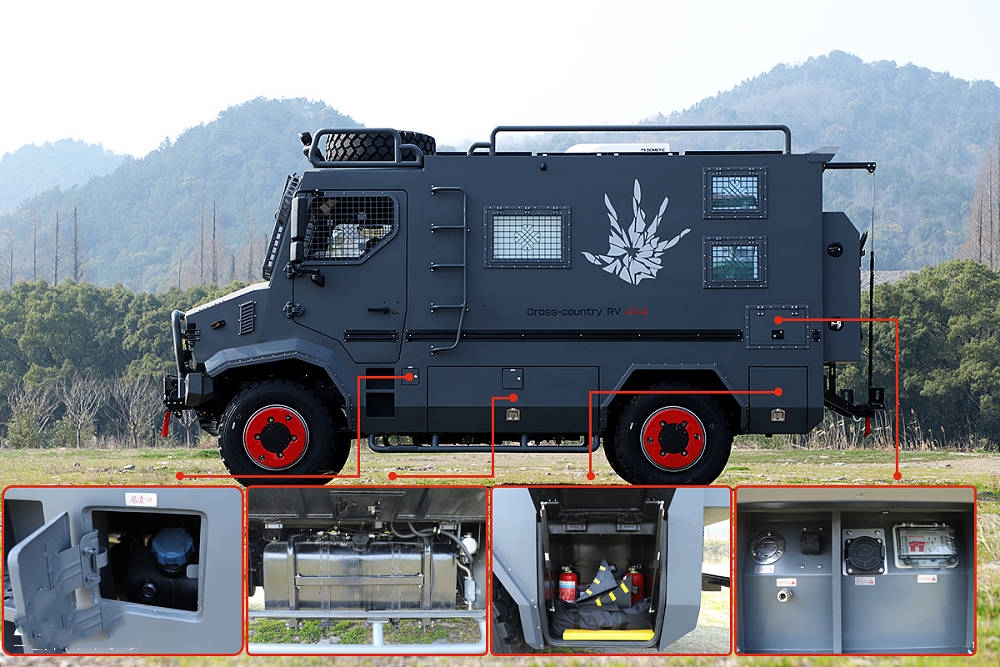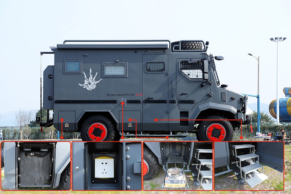 外觀涂裝方面,大膽采用機甲灰配色,還可定制顏色,加之硬朗造型,給了男人更想駕馭它的沖動!說到底盤、廂體結構和材質都大有來頭,整車電泳全鋼骨架+2.5mm厚的蒙皮鋼板結構;其中,全車電泳不易生銹;行業術語就是骨架蒙皮非承載式全鋼車身結構。東風猛士底盤配上軍用越野車專用車架,突出硬度高,抗扭性強的特點!另外,長鼻頭設計也有別于其它重卡車型,具有緩沖行程,有效保護駕駛員和乘員的人身安全。其實不管近看還是遠看,東風猛士甲四驅越野房車更像是一臺裝甲車,粗礦的線條,方正的輪廓,分明的菱角無不訴說其高大威猛的形象和濃郁的性格色彩。