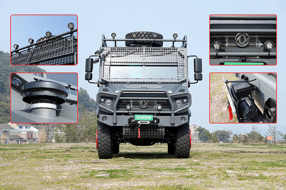 來到車頭正臉,全車車窗金屬防爆網包含(前擋風玻璃)可以抵御碎石等沖擊性障礙物。前擋風玻璃前部左右兩個需要時還可單獨打開,起到增強前方視野的作用。其它還包括駕駛室防滾架、車箱防滾架、粗壯的鋼制前防撞杠、前底盤護板、前后燈具防護網、探照燈(上4+下2兩個燈組形式)、高位沙漠濾清器(在沙漠運行時增加進氣量,有效過濾沙質顆粒)、前12000磅絞盤。其中,探照燈大大增加夜間行車安全性;而電動絞盤則便于自行脫困和救援其它車輛。整車涉水深度達到了驚人的800mm-900mm。
