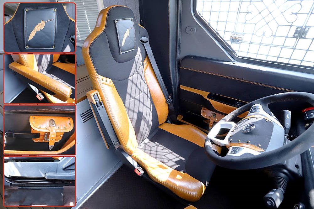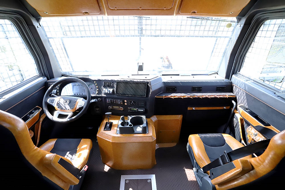 整個駕駛室采用印第安風格黃色配色風格,鋼材質中控也別具一格。配置包括主駕駛氣囊減震座椅+副駕駛2座形式中檔座椅;細節方面值得表揚,體現在楓葉圖案的頭枕logo、收納扶手及印第安風格的輕量化側收納袋;另外,為方便進入副駕駛,室內設計有上車扶手。如何征服世界征服眼前這臺鋼鐵猛獸,只需坐在駕駛室眼望前方即可,方向盤相對精致,握感良好輕盈,開起來并不笨拙。