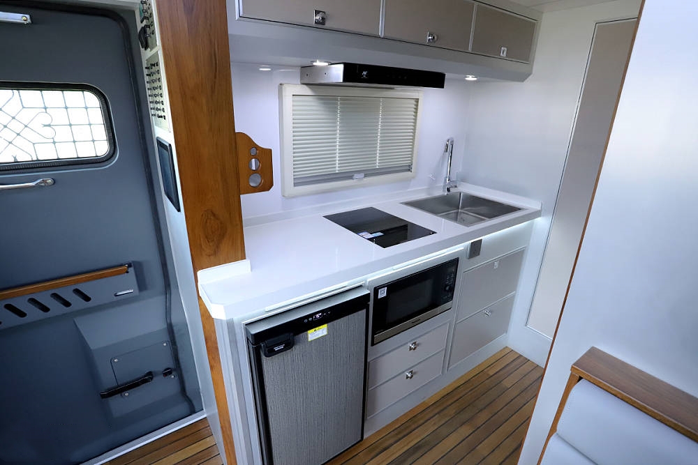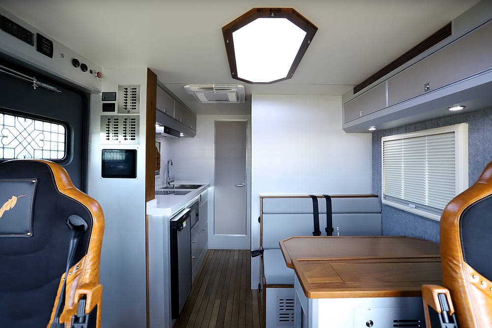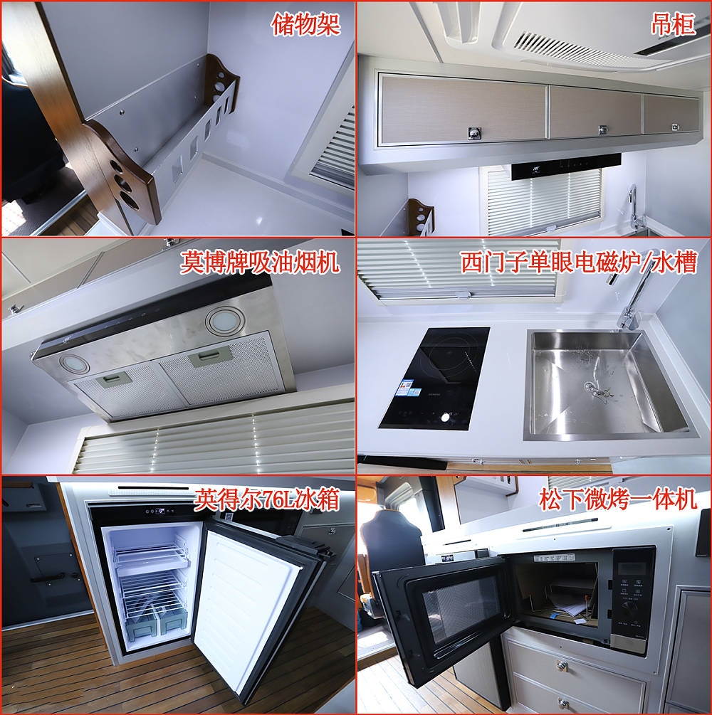 廚房區域包括儲物架、吊柜、莫博牌吸油煙機、西門子單眼電磁爐/不銹鋼水槽+水龍頭、英得爾76L冰箱及松下微烤一體機。功能相對集中體現出距離短高效的作業方式。其它生活配置包括全自動水泵、水路系統、2臺4WK偉巴斯特暖風機、多美達Harrier Plus頂置駐車空調、9KW偉巴斯特即熱式熱水器及原車360°監控系統。