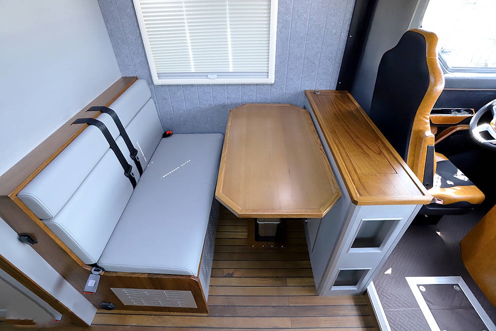 會客區采用雙人卡座沙發+電動升降餐桌的形式,沙發坐墊尺寸49×108(cm)。會客區配有兩條獨立安全帶,加之駕駛室前排整車核載4人。官方給出的額定乘員數可達10-19人,也就是說開著它就代表著移動的“空中堡壘”;搭配車頂平臺可實現會議洽談、婚紗攝影、生日party、朋友聚會等多場景需求;座椅表面配色方面采用與室內風格遙相呼應,更易耐臟。除側窗外,頂部并排兩組吊柜空間充足,寬約70cm,縱深23cm,收納物品也非常方便。