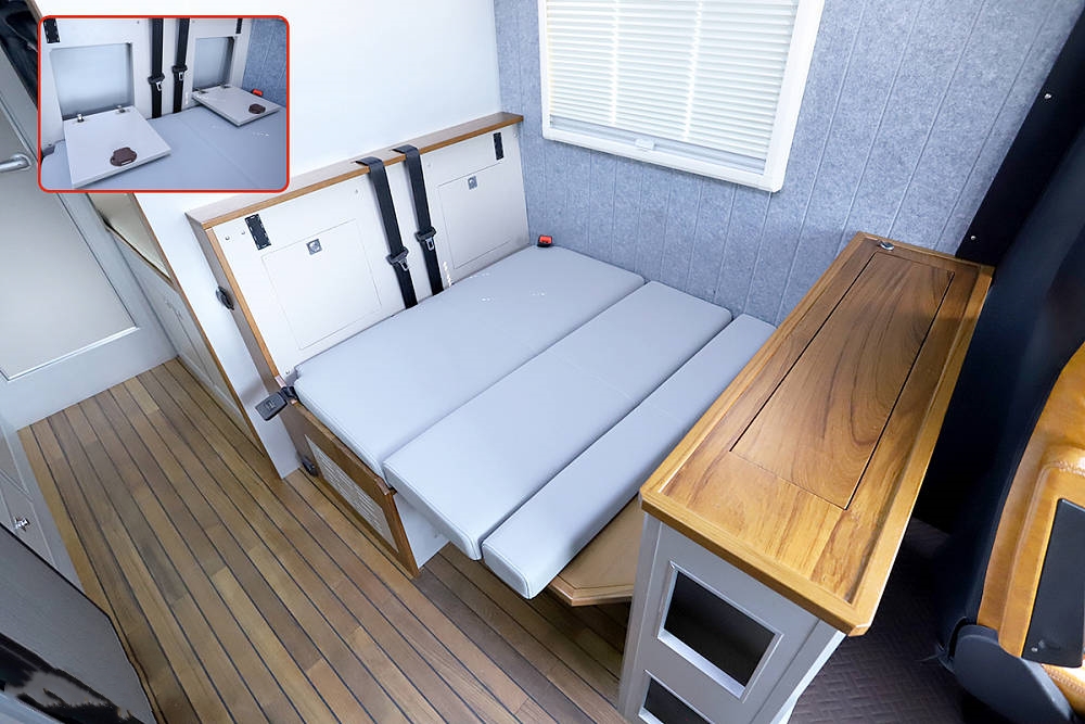 一體化開發設計的車身結構,駕駛室和后倉整體成型,最終呈現出前后大通倉的室內形式;最大限度的保證車輛在全方位碰撞和翻滾時的變形度,使駕乘人員得到最大的保護!整車保溫采用聚氨酯發泡復合氣凝膠墊工藝,總厚度60毫米,三層保溫效果優異!另外,玻璃保溫隔熱效果特別好,表現在大太陽外邊燙里邊冰的效果。主附材料全部采用0甲醛材料,車內鋁木混編家居美觀,簡單說就是雙色拉絲鋁板搭配實木材質,實用壽命長,柚木防水地板革設計也較為常用,保證車內空氣環境安全!