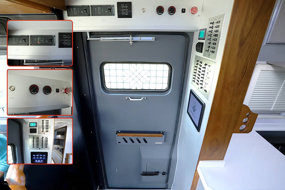 乘客門上方分別是雙逆變器、遮陽棚、衛生間照明、暖風/熱水及總電源控制開關。值得一提,就連逆變器艙都采用防輻射處理,避免了逆變電磁輻射!整車生活區配備的雙備份系統最為值得稱贊,翹板開關和觸屏面板無論何時何地,不管遇到什么困難都可切換自如,保證各設備正常使用。水電路方面,包括220L不銹鋼凈水箱、防凍灰水箱及黑水箱、電動排污閥、880W太陽能板+28V 150A發電機、24V 800Ah磷酸鐵鋰電池(400Ah+400Ah共兩塊,19.2度電)、3kW+3kW雙逆變器將作為整臺車用電儲備。另外,對于生活品質苛刻的用戶來說可選裝370L凈水箱來滿足旅居需求。