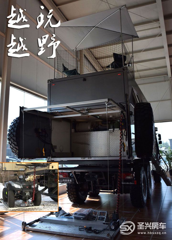 可以穿越熱帶雨林、高原山峰和沼澤濕地,甚至能抵達(dá)其他車輛無(wú)法通過(guò)的低凈空高度。后車廂內(nèi)部則有熱水器,以及燃油取暖用的油箱。這一點(diǎn)奔馳倒做得相當(dāng)細(xì)心,后尾箱空間巨大,放一臺(tái)全地形車不足話下,還擁有電動(dòng)升降設(shè)備,裝卸無(wú)需費(fèi)力,一鍵搞定。