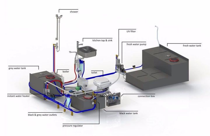 整車配有3個(gè)水箱:一個(gè)清水箱、一個(gè)灰水箱和一個(gè)污水箱。清水箱安裝在產(chǎn)品的前面,灰水箱和污水箱都安裝在后面。水箱位置安排是總設(shè)計(jì)的要求,以確保產(chǎn)品重量達(dá)到最佳平衡。為了保證供水質(zhì)量,水管系統(tǒng)中集成了幾個(gè)過(guò)濾系統(tǒng)。當(dāng)過(guò)濾清水箱中的水時(shí),水從沉淀濾芯通過(guò)。水要經(jīng)過(guò)沉淀、活性碳和紫外線過(guò)濾器后,才能使用,以保證所用水百分百的清澈干凈,安全為最重要。