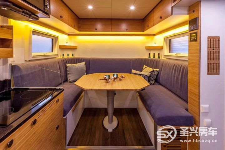 車廂內(nèi)部不僅提供了所有居家設(shè)施,而且還有周密的多功能設(shè)計(jì),為您提供一個(gè)溫馨而誘人的空間使您的旅途更加愉快。主要配有固定尺寸的舒適雙人床、一6個(gè)人的U形沙發(fā)(可轉(zhuǎn)換為一張雙人床)、設(shè)備齊全的廚房、一個(gè)寬敞的臺(tái)面與集成的電磁爐。盥洗室和浴室分開,90度的時(shí)候淋浴房門可以分隔間生活和睡眠功能區(qū)。位于床下還安置有一臺(tái)滾筒洗衣機(jī)。